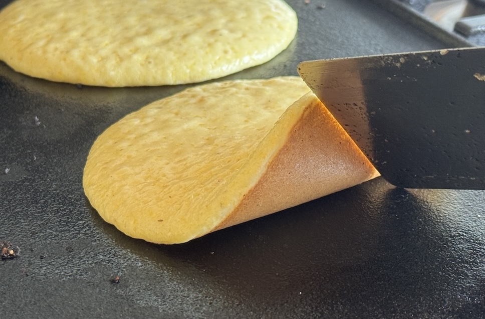 Cook a couple minutes, checking the bottom with a spatula and flipping when it’s an even, deep golden brown. The top should be bubbling lightly, but without the bubbles bursting.