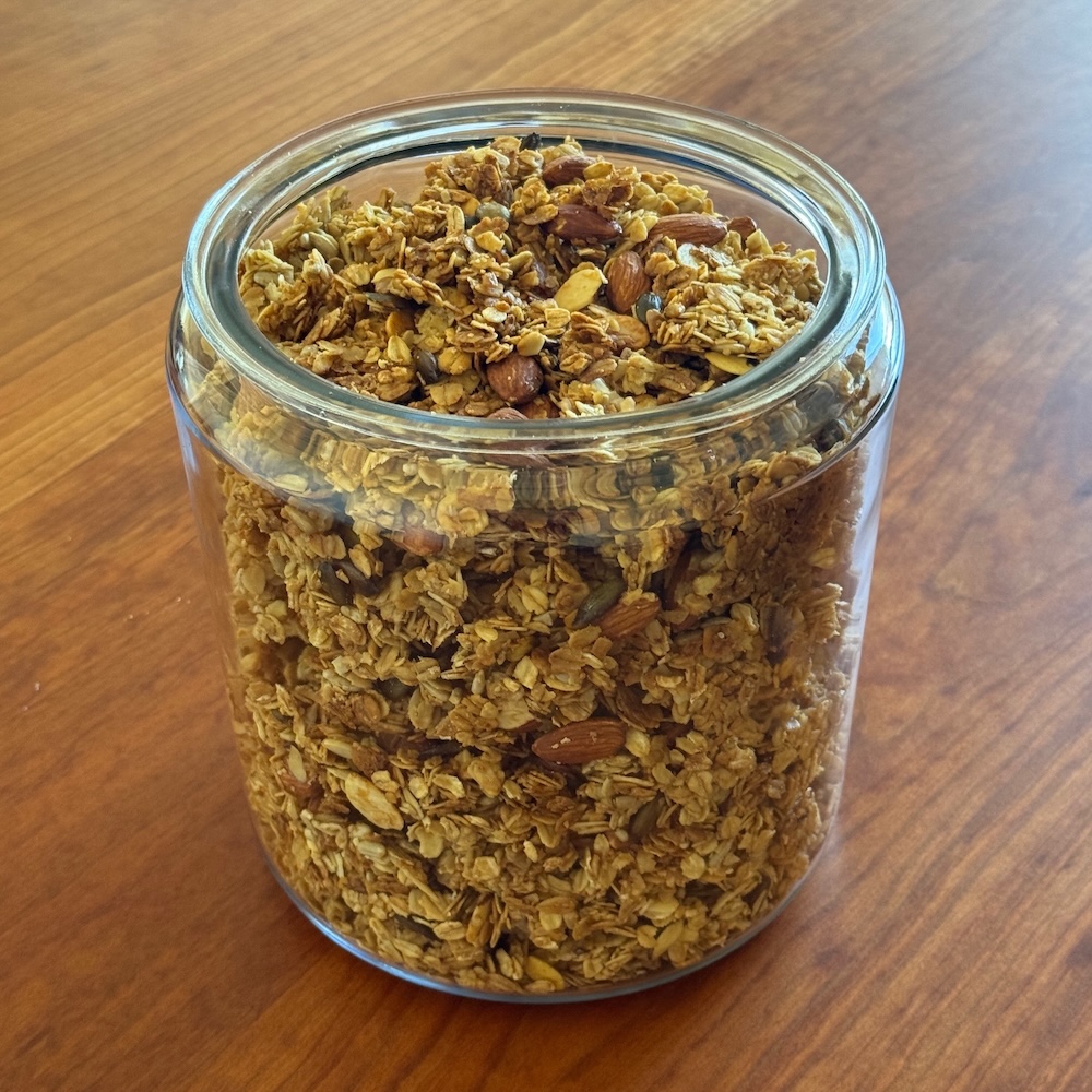 Spread the granola mixture evenly across them about 1.5 cm½” deep and, for extra credit, leave a 1 cm½” buffer around the edge to prevent overcooking. (If you need to do batches: the raw granola is about 1900g3½ lb. all together.)